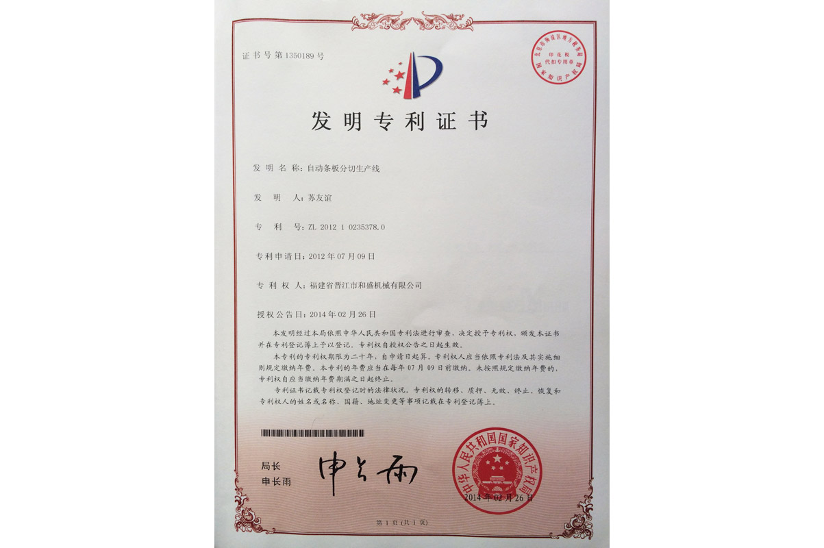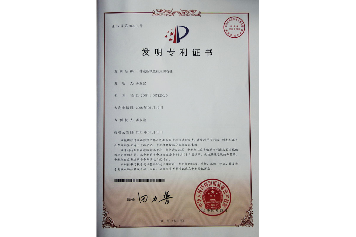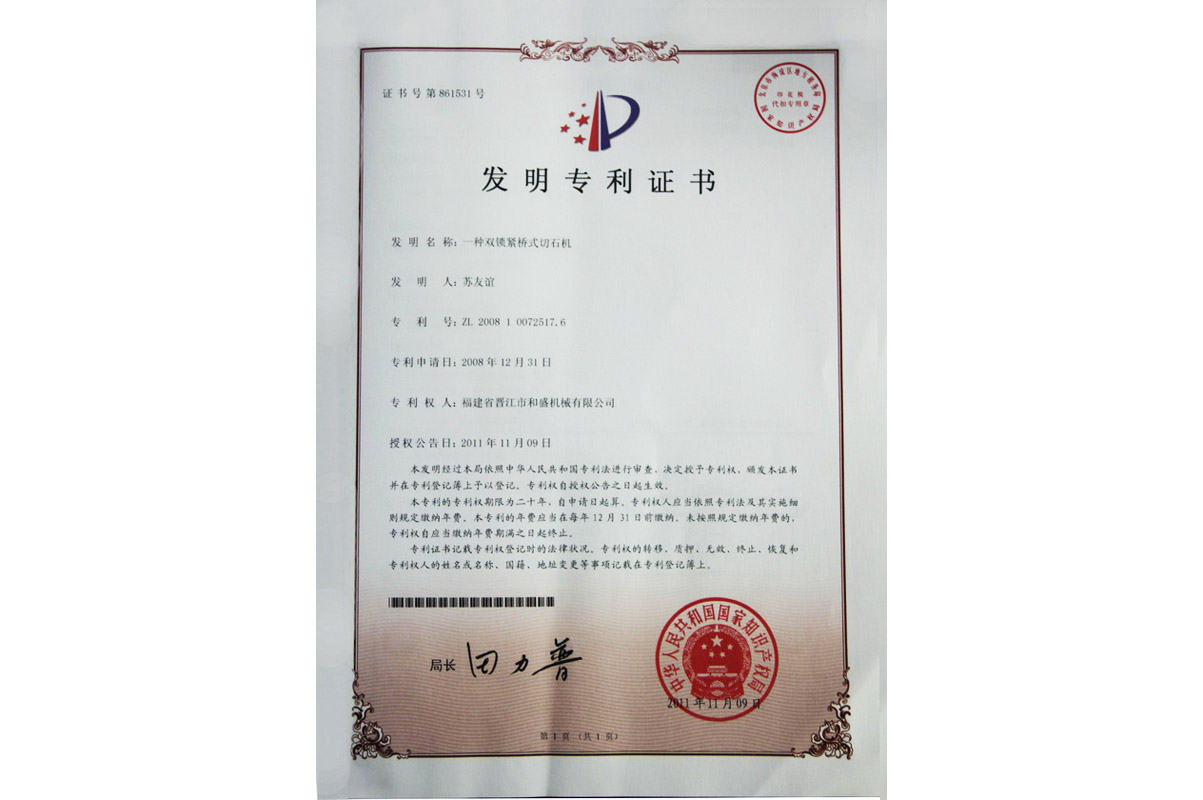 雙鎖緊橋式切石機(jī)發(fā)明專(zhuān)利證書(shū)