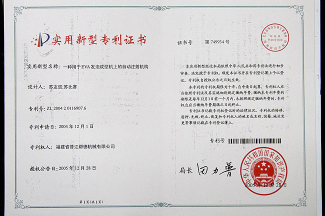 自動(dòng)注射機(jī)構(gòu)實(shí)用專(zhuān)利證書(shū)