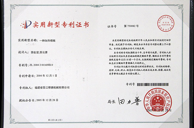 一種加熱模板實(shí)用專(zhuān)利證書(shū)