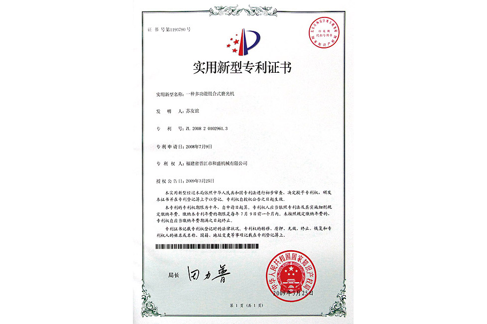一種多功能組合式磨光機(jī)實(shí)用專(zhuān)利證書(shū)