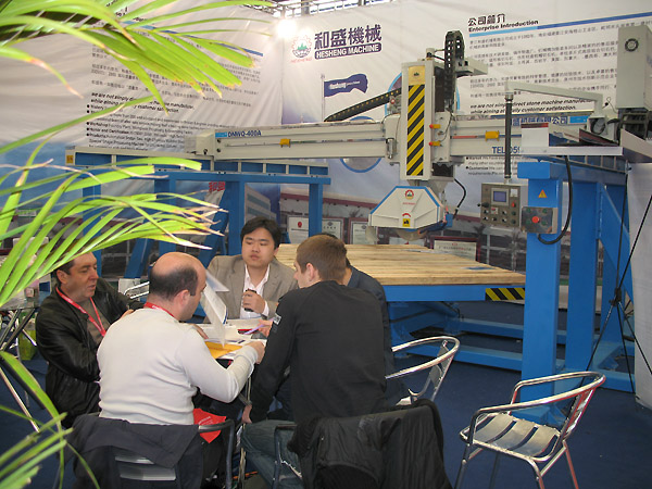 展會現場工作人員講解設備 圖片展示發布時間:2017-04-27 游覽:14418和盛石材機械專業生產石材加工成套設備;主要有石材切割機,石材拋光機,石材切邊機;異形類切機等幾大類;主產品有液壓組合切石機,液壓橋式切石機,全自動花崗巖條板磨光機,礦山切石機,自動切邊機,紅外線橋切機,橋式中切機,板底修平機,橋式組合切割機等等。現有新老廠房使用面積約90000平方,有機械鑄造廠、機械加工車間、機械生產車間和技術研發室等,產品暢銷全國,深受用戶好評,并遠銷東南亞等國家和地區,歡迎各界朋友來廠參觀考察,我們將竭誠為您服務。