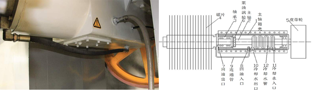 3:主軸箱采用專利技術“切石機刀具主軸冷卻結構”,解決了切石機作業過程中主軸易發熱問題,可進一步提升潤滑油降溫效果,大大提高主軸箱軸承、主軸等使用壽命,降低維修成本。