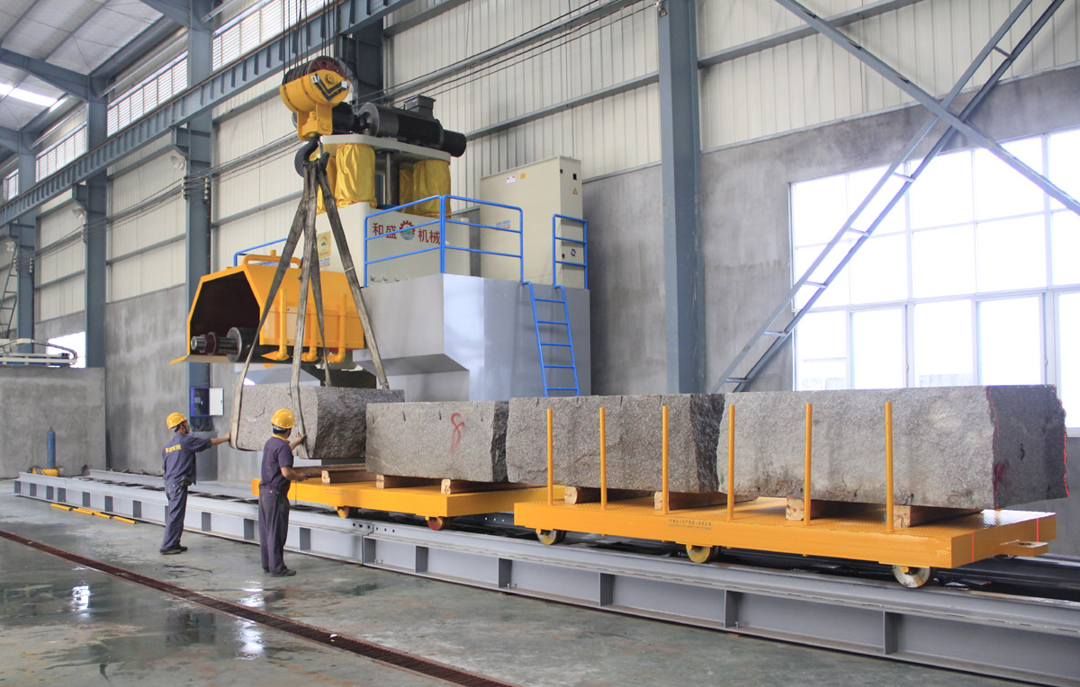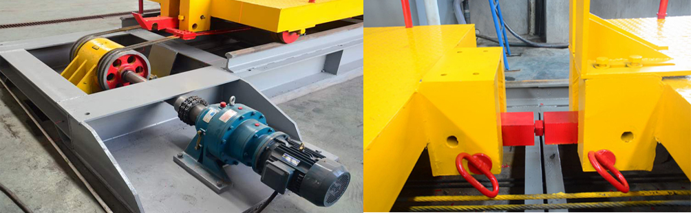 4:工作料車采用往復驅動裝置,可提高料車行走效率有利于提高產量。料車與牽拉帶的連接部位加裝有“載料車分合插銷”,解決了老機型更換荒料時要在工作臺上調整荒料位置后才能開機作業,浪費有效加工時間的問題。
