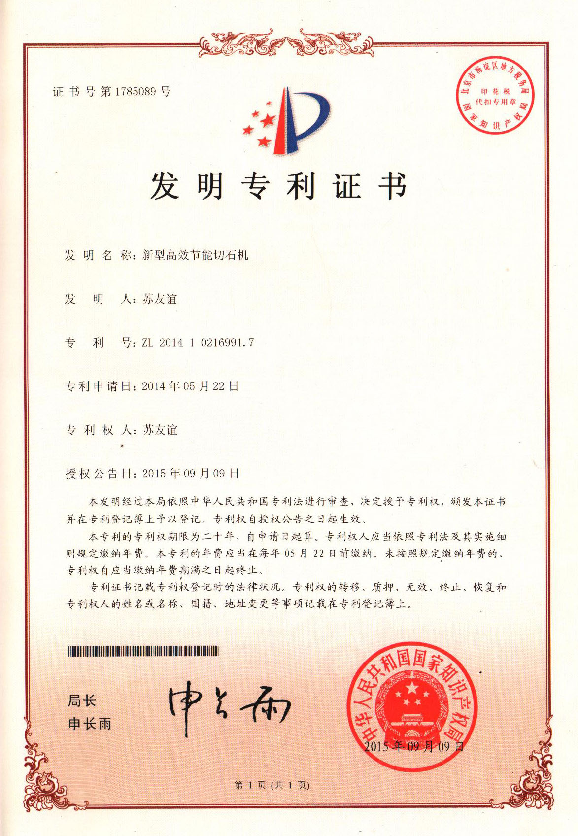發明專利證書(仿冒必究)  查詢(點擊)