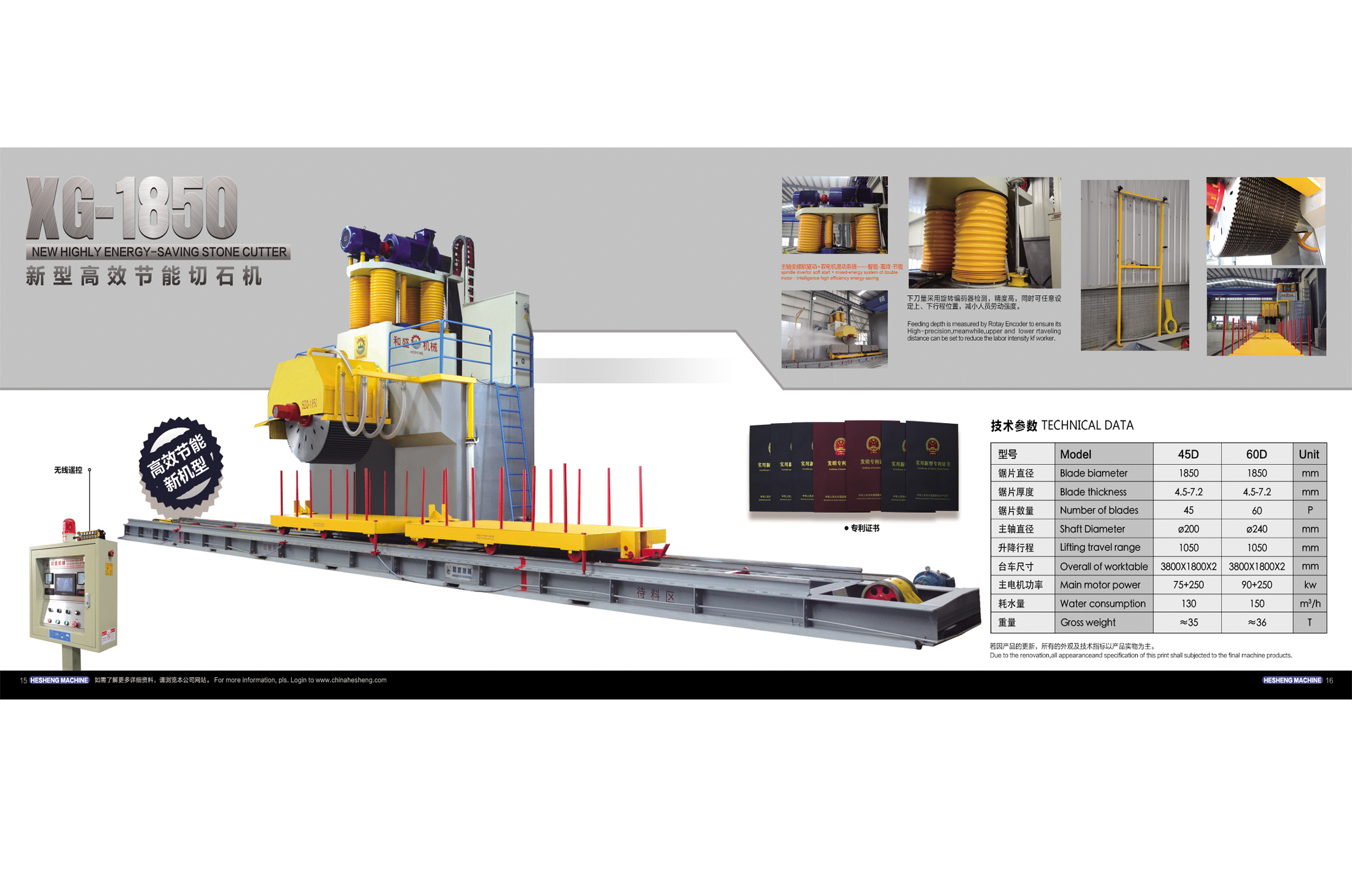 XG-1850新型高效節能切石機,采用了機、電、儀、液一體化高新技術和公司6件發明專利和9件實用新型專利技術,經反復的試驗改進,創新開發的新一代切石機產品。它具有結構新穎、剛性好,切割效率高、切割的板材表面平整度好,生產成本低,節能降耗顯著、操作維修方便等特點。它與傳統的切石機相比,切割同一規格的石荒料可以多切5~8%的板材,節約石料11%,減少石粉排出40%左右,節約耗能約10~15%。